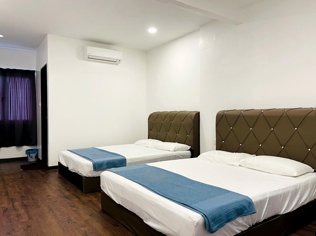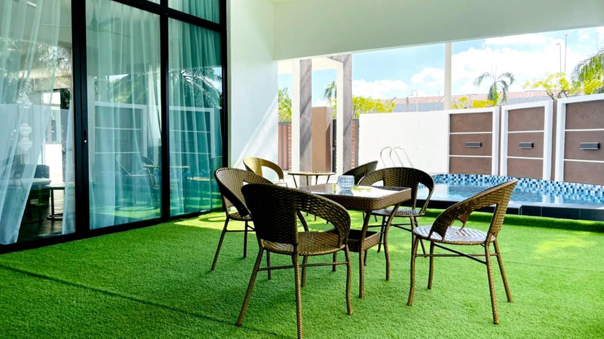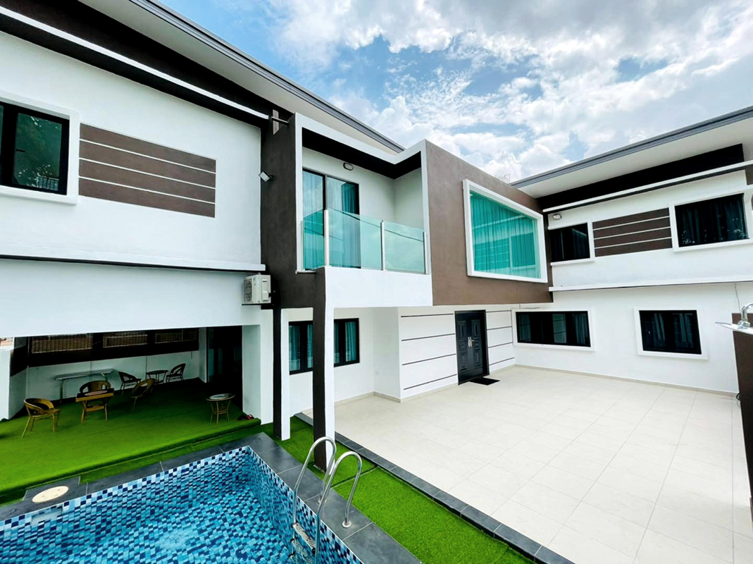 The 1 Villa Modern Homestay is a corner unit villa featuring a private pool, located in Taman Putra Perdana, Puchong. This unit can accommodate up to 25 guests in its 9 air-conditioned bedrooms, each with an attached bathroom. It offers a perfect, cozy setting for staycations and gatherings with friends and family.